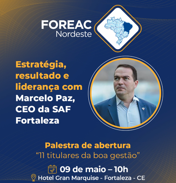 30 de abril de 2025Na sexta-feira, dia 9 de maio, o FOREAC Nordeste começa com o pé direito: Marcelo Paz, CEO da SAF Fortaleza, abre o evento com a palestra “11 titulares da boa gestão”, compartilhando bastidores, visão estratégica e os aprendizados que transformaram o Fortaleza Esporte Clube em referência nacional.